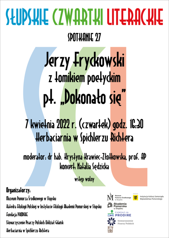 Katedra Filologii Polskiej w Instytucie Filologii Akademii Pomorskiej w Słupsku wspólnie z Muzeum Pomorza Środkowego w Słupsku, Fundacją PRODIRE, Stowarzyszeniem Pisarzy Polskich Oddział Gdańsk i Herbaciarnią w Spichlerzu Richtera zaprasza na dwudzieste siódme spotkanie z cyklu Słupskie Czwartki Literackie. Spotkanie odbędzie się 7 kwietnia 2022 r. o godz. 16:30 w Herbaciarni w Spichlerzu Richtera w Słupsku.