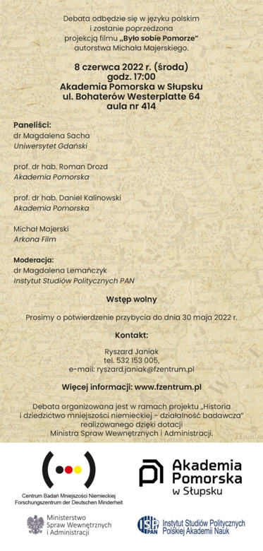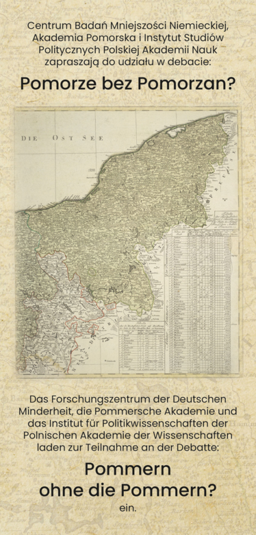 W imieniu Centrum Badań Mniejszości Niemieckiej, Instytutu Filologii Akademii Pomorskiej w Słupsku oraz Instytutu Studiów Politycznych PAN z radością mamy przyjemność zaprosić Państwa na debatę pt.: "Pomorze bez Pomorzan?".