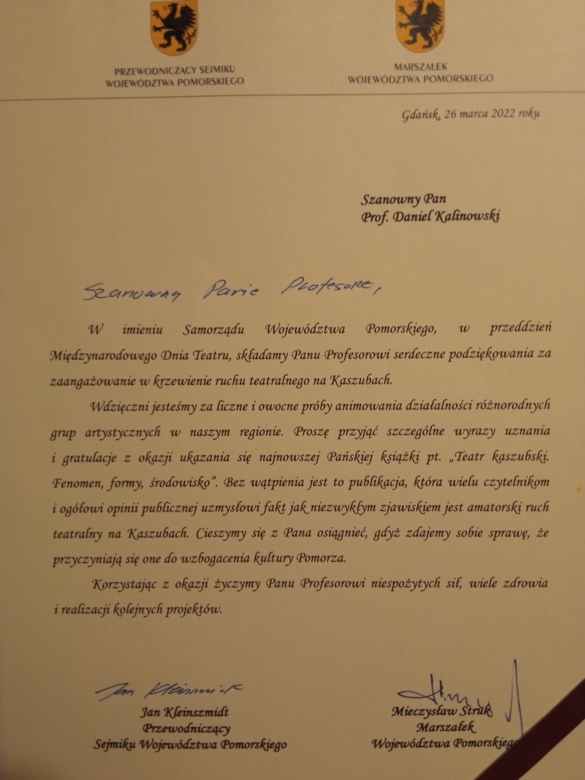 Prof. dr hab. Daniel Kalinowski z Instytutu Filologii naszej Uczelni w akcie docenienia jego działań w zakresie popularyzacji teatru kaszubskiego otrzymał od Marszałka Województwa Pomorskiego Mieczysława Struka i Przewodniczącego Sejmiku Pomorskiego Jana Kleinszmidta Medal "De nihilo nihil fit".