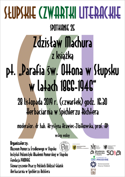 Instytut Polonistyki Akademii Pomorskiej w Słupsku wspólnie z Muzeum Pomorza Środkowego w Słupsku, Fundacją PRODIRE, Stowarzyszeniem Pisarzy Polskich Oddział Gdańsk i Herbaciarnią w Spichlerzu Richtera zaprasza na dwudzieste piąte spotkanie z cyklu Słupskich Czwartków Literackich. Spotkanie odbędzie się w ostatni czwartek miesiąca, tj. 28 listopada 2019 r. o godz. 16:30 w Herbaciarni w Spichlerzu Richtera w Słupsku. Bohaterem XXV SCL będzie Zdzisław Machura ze swoją najnowszą książką pt. Parafia św. Ottona w Słupsku w latach 1866-1946.