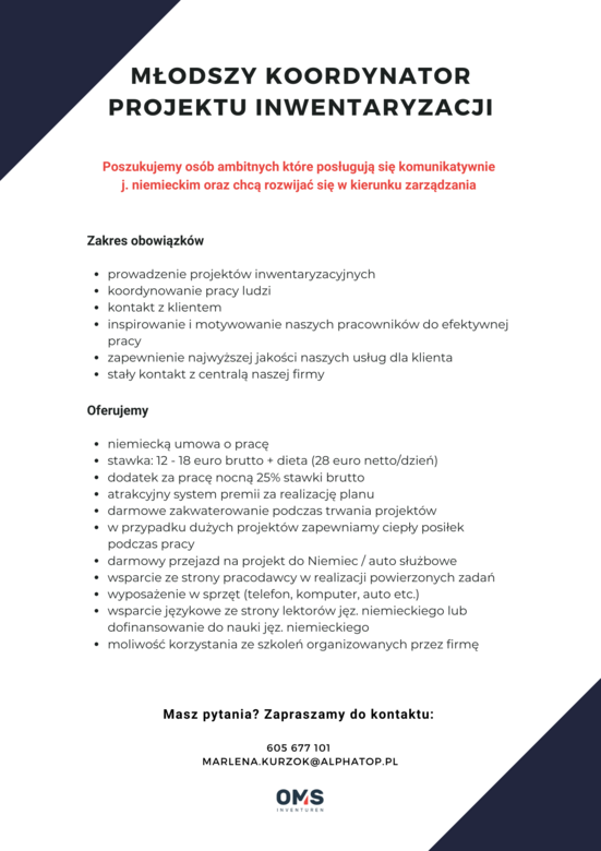 Oferujemy niemiecką umowę o pracę, zapewniamy i opłacamy przejazdy i noclegi. Zapewniamy wszelkie potrzebne szkolenia i kursy. Nasza strona internetowa to www.oms-inventuren.de