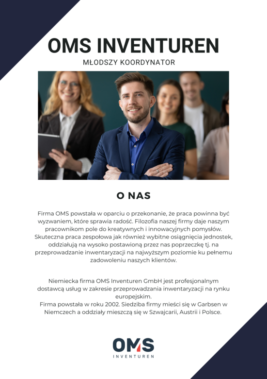 Nasza firma to OMS Inventuren GmbH, jesteśmy najszybciej rozwijającą się firmą inwentaryzacyjną na rynku niemieckim, przeprowadzamy inwentaryzacje na terenie Niemiec, Szwajcarii, Austrii, Czech. Poszukujemy kandydatów na stanowisko Koordynator (Teamleiter) zespołu inwentaryzacyjnego na terenie Niemiec.